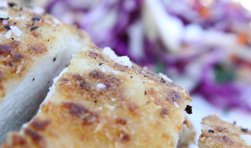 Place the chicken breasts in a glass dish with the buttermilk and mustard and stir to coat well. Cover and leave in the fridge for about 30 minutes to marinate. Put the breadcrumbs onto a plate and then lift the chicken out of the marinade and coat well with the crumbs. It’s good if you can do this a little ahead of time and put the chicken back into the fridge for about 20 minutes. Heat the oil and butter in a shallow, non-stick frying pan until sizzling. Cook the chicken over a medium heat for 6 – 8 minutes each side, or until the coating is crispy and golden and the chicken cooked through. The cooking time does depend a little on how thick the thickest part of the chicken is. Season with salt and pepper  then  slice the chicken horizontally into 4 or 5 pieces and serve with the slaw.