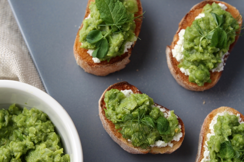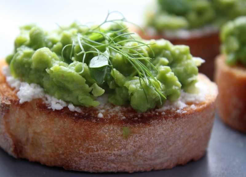 These beautiful little morsels are very easy to make, but look and taste as if they took a whole lot of effort and skill. Peas are gently simmered in a little stock that has been flavoured with onion, garlic and fennel, then mashed up and piled onto toasted bread rubbed with fresh garlic and spread with some soft feta cheese. Fresh mint and snow pea sprouts finish them off and make them look just a little bit fancy.