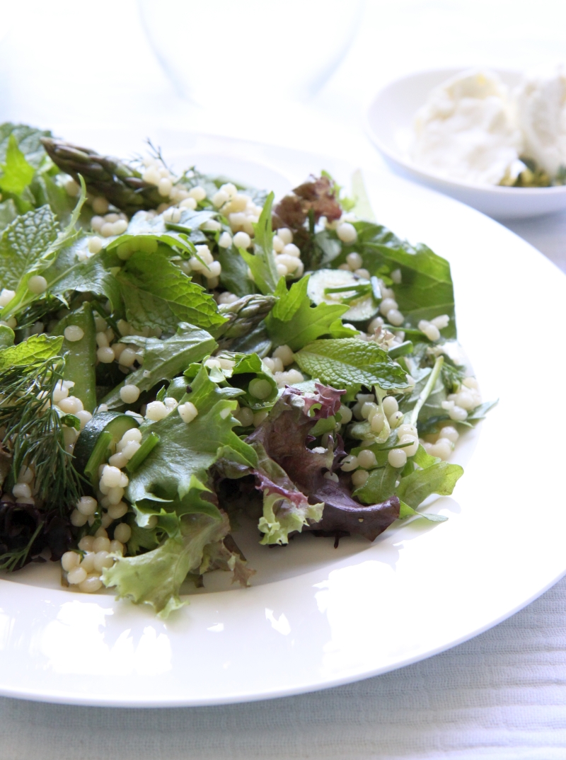 This delicious salad sparkles with summer flavours and textures, and I do believe that it makes perfect sense for all of them to be there; in the bowl, on the plate, and in the mouth. Crisp salad leaves, fresh herbs, lemony dressing and summer green vegetables, sweet and fragrant. We have a vibrant and very productive herb garden so at our place the large quantity of herbs is easy to gather. They really make the dish, so don’t scrimp on them. I like to pass soft feta cheese separately, so that people can add what suits their palate.