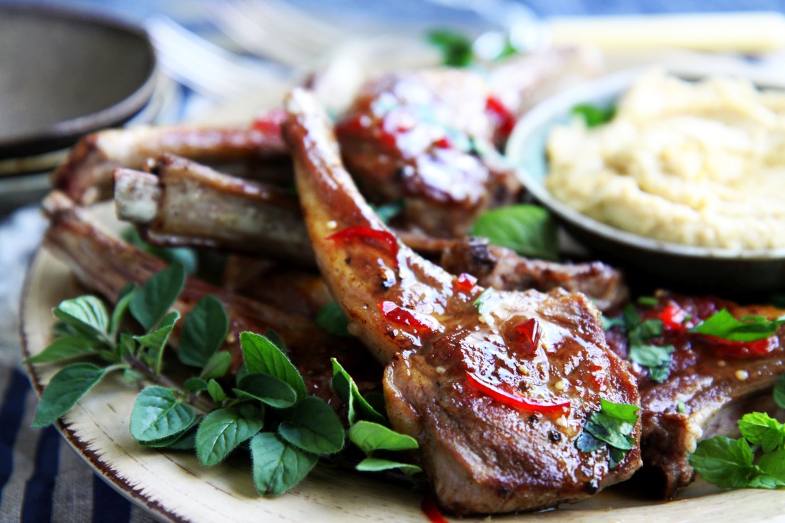 Today we departed from our usual Anzac Day tradition of making and eating Anzac biscuits in favour of these most delicious lamb cutlets with cumin and home made sweet chilli sauce. Having been up and about quite early for my youngest who was marching in the local Anzac Day service, we were ready for a hearty lunch. The combination of great quality meat, and some of lamb’s best buddies – cumin, chilli, hummus and loads of fresh herbs, makes this recipe a delight to prepare and eat. The secret is to have the pan or grill really hot and to cook the lamb for only a couple of minutes each side, brushing on the sweet chilli sauce in the last minute of cooking and then liberally sprinkling with fresh herbs. I used home made sweet chilli sauce, because we have been inundated with chillis in the vegetable garden, but good quality store-bought sauce will also give an excellent result.