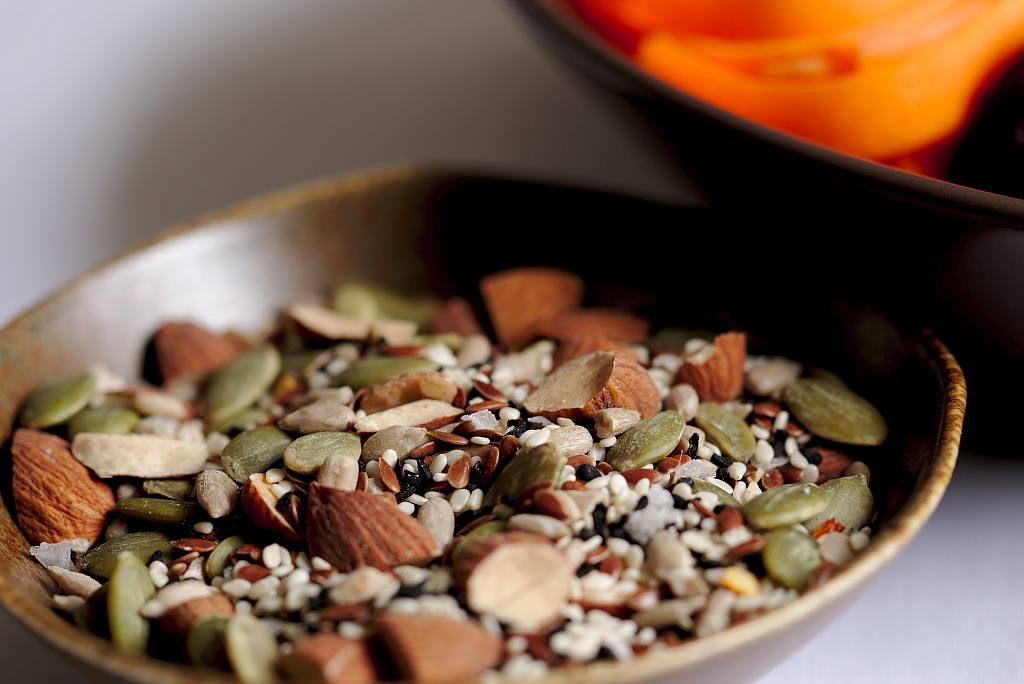 Seeds are a powerhouse of nutrients and have many benefits to our health. They contain healthy monounsaturated fats, polyunsaturated fats and many important vitamins, minerals and antioxidants and they also taste delicious! I like to use seeds (and also some nuts) to make a treat to sprinkle over salads, or to serve with hummus and other dips. They add texture and flavour, as well as being much lower in fat than many dressings. Also wonderful is tossing them through roasted carrots, beetroot or sweet potato just before serving.