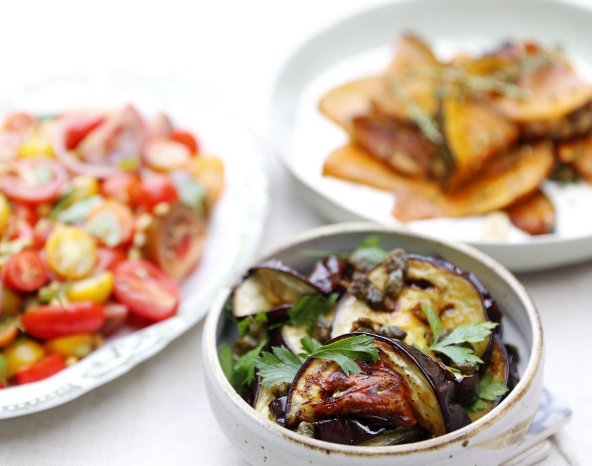 Preheat oven to 180 C. Slice the eggplants into 1 cm slices. Pour the olive oil onto a large baking tray. Take each slice of eggplant and quickly coat both sides with the olive oil and then place in a single layer on the tray. Season well with sea salt and then bake for 35 – 40 minutes in the oven until golden brown and a little charred around the edges. Meanwhile heat a non-stick pan over high heat, and a splash of olive oil and quickly fry the capers until they are crispy. Drain on absorbent paper and set aside. When the eggplant is cooked carefully turn over once to lightly glaze with any of the remaining oil and then place in a serving dish. Sprinkle with the parsley and capers and serve hot, warm or at room temperature.