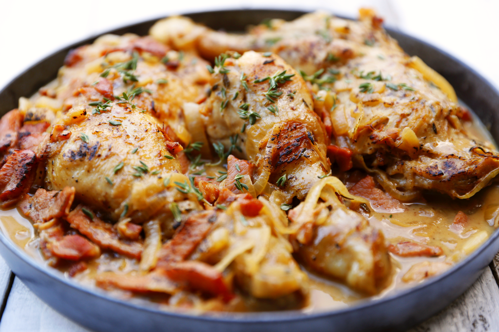 Preheat oven to 180 C. Place a large frying pan over a medium heat and add the olive oil. Add the chicken and brown the pieces all over until golden brown. Remove from the pan, and set aside. Place the onion, garlic, bacon and thyme into the pan and saute until the onion is softened. Take care not to burn the garlic. Turn the heat up to high. Pour in the cider and cook for a couple of minutes before adding and Dijon mustard. Use a wooden spoon to stir and scrape off any of the delicious crispy bits stuck to the bottom of the pan. Remove from the heat. Place the sauce in the bottom of a medium-sized casserole dish. Add the chicken pieces in a single layer and spoon over some of the sauce. Season well with salt and freshly ground black pepper. Cover tightly with foil and bake in the oven for 35-40 minutes. Remove the foil and spoon a little more of the sauce over the chicken and return to the oven for another 10 minutes. Remove the cooked thyme before serving and scatter over about a tablespoon more of fresh thyme leaves, and another generous grind of black pepper.
